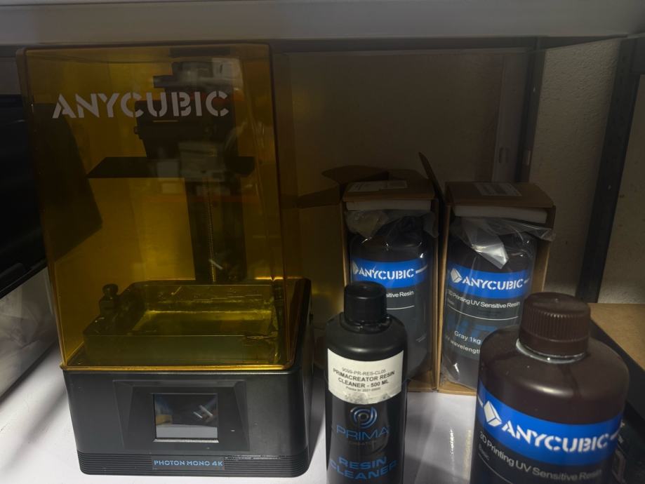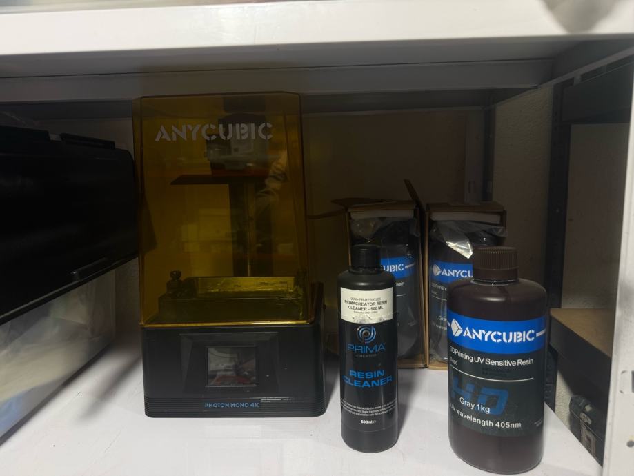 Uz printer dolaze i dodatci vidljivi na fotografijama: nekoliko bočica Anycubic resina te sredstvo za čišćenje resin cleanera. Otvoreni su puni cca 60%, dovoljno za duug rad, pored onih u pozadini koji su novi i neotvoreni.