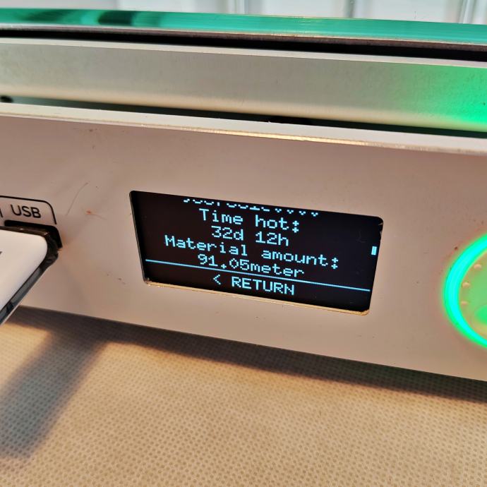 Printer je pažen i mažen, nije puno korišten, a vidljivo je stanje na slikama - hot time i koliko je filamenta prošlo kroz njega. (32 dana rada i 91 m utrošenog materijala). Redovito je održavan, upravo očišćen do najmanjih detalja, nauljen i stavljena mast na trapezoidnu šipku za Z-os.