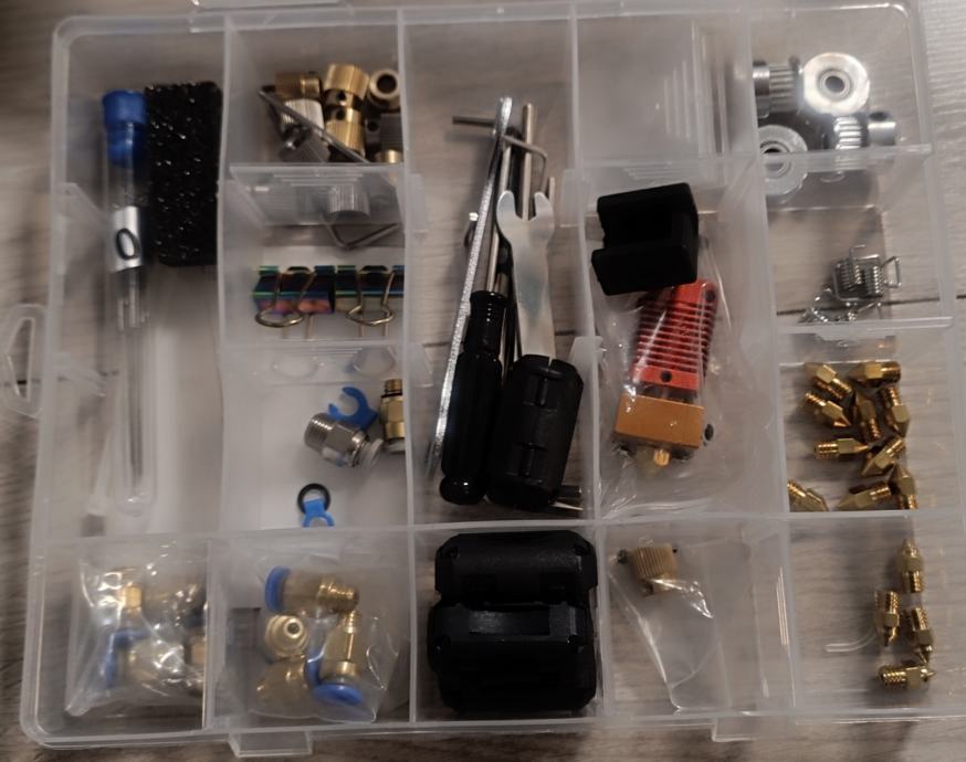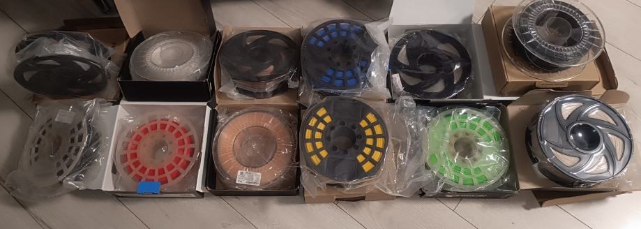 Uz printer 1 neotvoren kolut, 6 gotovo nedirnutih koluta, 3 koluta sa cca 75% filamenta, 3 koluta gratis (od ta tri koluta jedan bi se nakupio cijeli) i dosta rezervnih dijelova za printer...