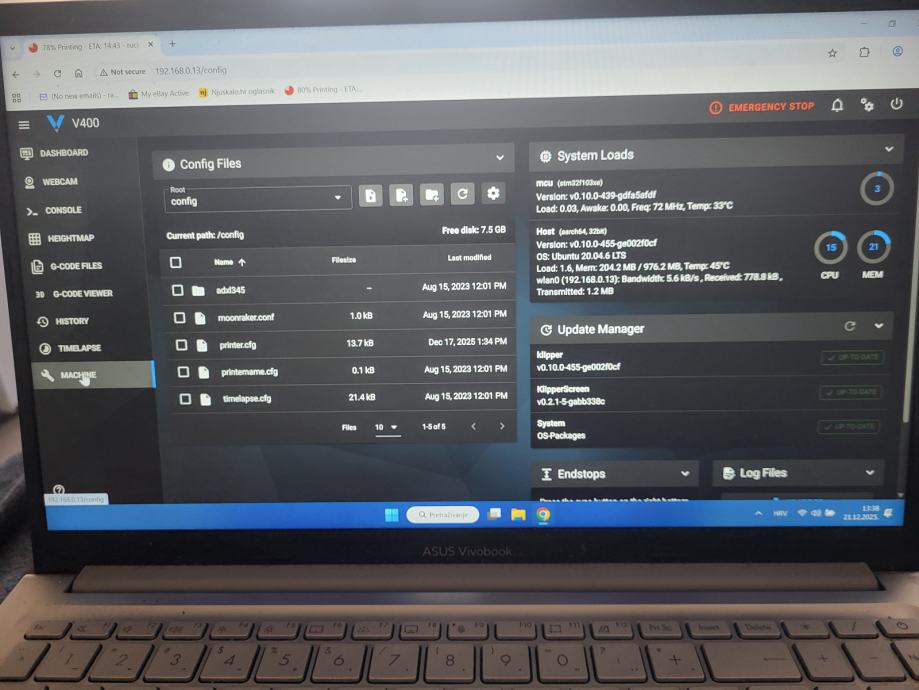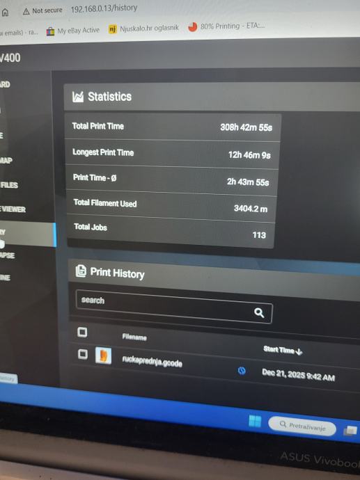 Printer je star oko godinu dana .Stajao je uskladišten u rezervi ako zatrebaju djelovi za ostale printere. U zadnja dva tjedna je otprintao cca 300 sati . Radi dobro .