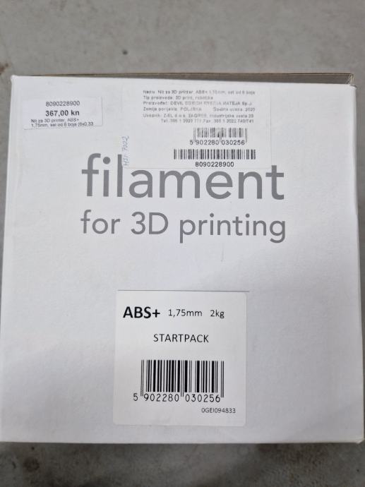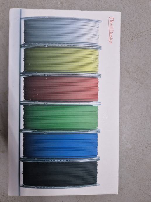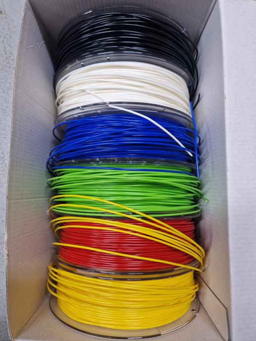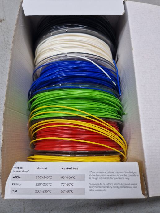 Prodajem filament za 3D printanje, ABS+ materijal u startnom paketu. Debljina filamenta je 1,75mm, a težina 2kg. Paket sadrži šest zavojnica u bojama: siva, žuta, crvena, zelena, plava i crna. Filament je pogodan za većinu 3D printera koji koriste 1,75mm filament.