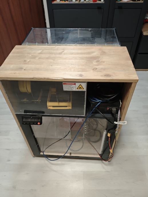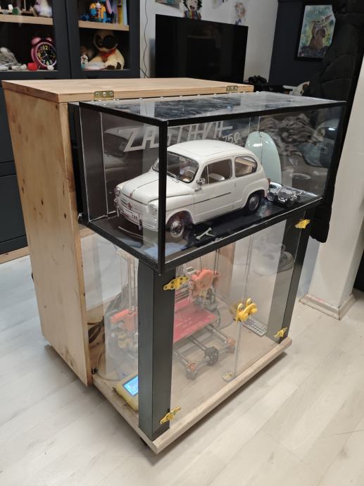 Kučište ima led rasvjetu,prostor za filamente sa rolerima i izložbenu vitrinu (model nije u kompletu,služi kao primjer).