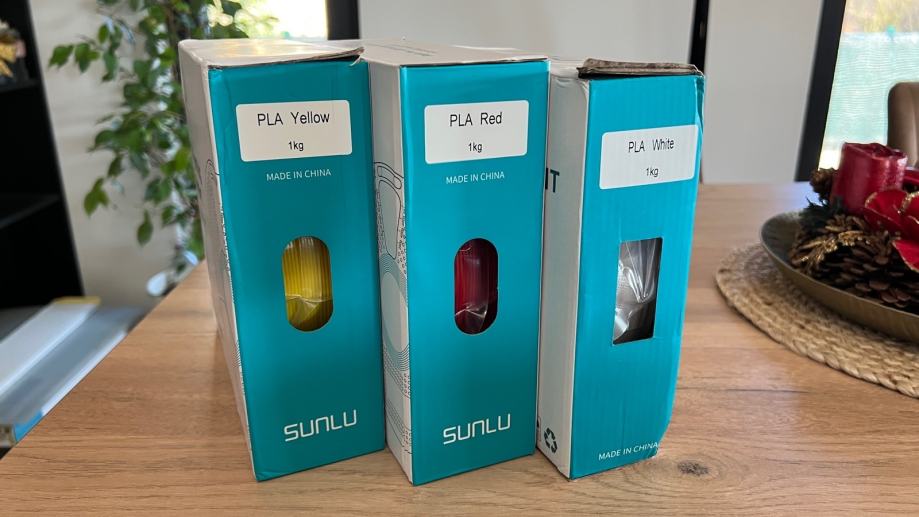 Prodajem Sunlu PLA lot od tri boje, bijela, žuta i crvena.