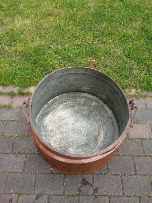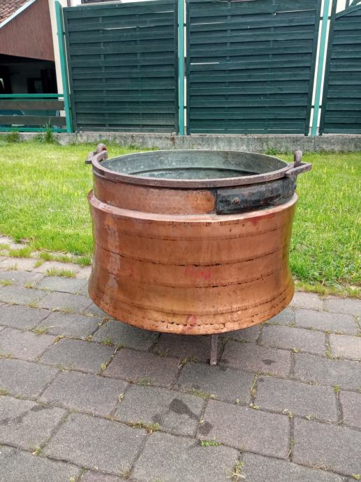 Bakreni kotao iznutra pocinčan. Zapremine 60-70 litara. Gornji promjer 50cm, donji 54cm, ukupna visina 35cm. Dno blagozaobljeno, zato stoji na željeznom tronošcu. Čvrsta ručka od kovanog željeza, zakovana za rub kotla.