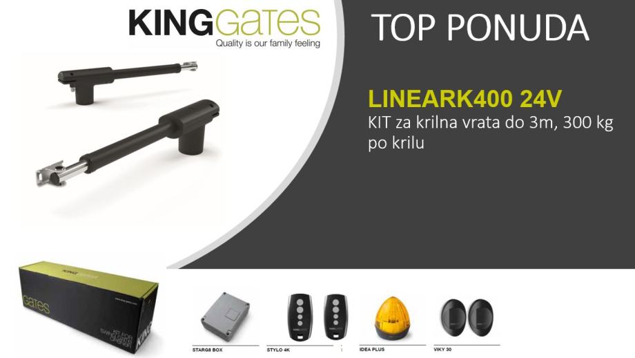 KING GATES je talijanski proizvođač vrhunske automatike sa širokom ponudom automatika za vrata ( https://king-gates.com/en/ ).