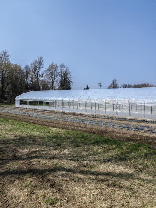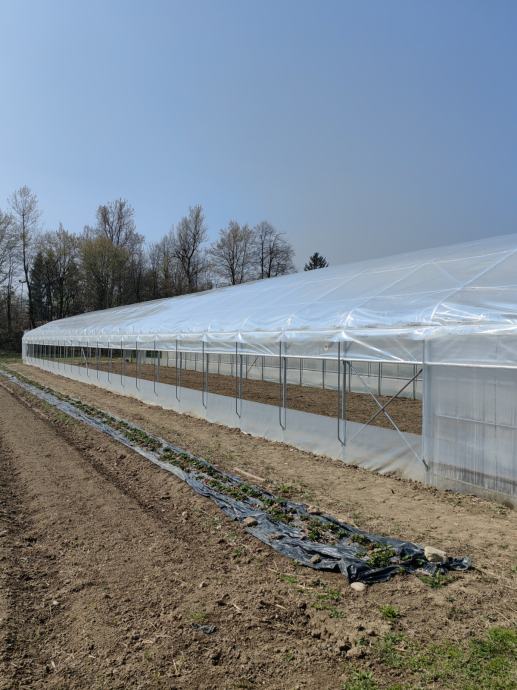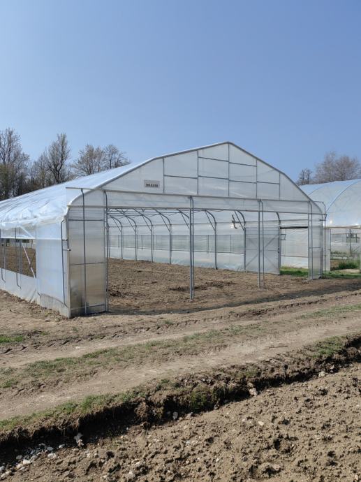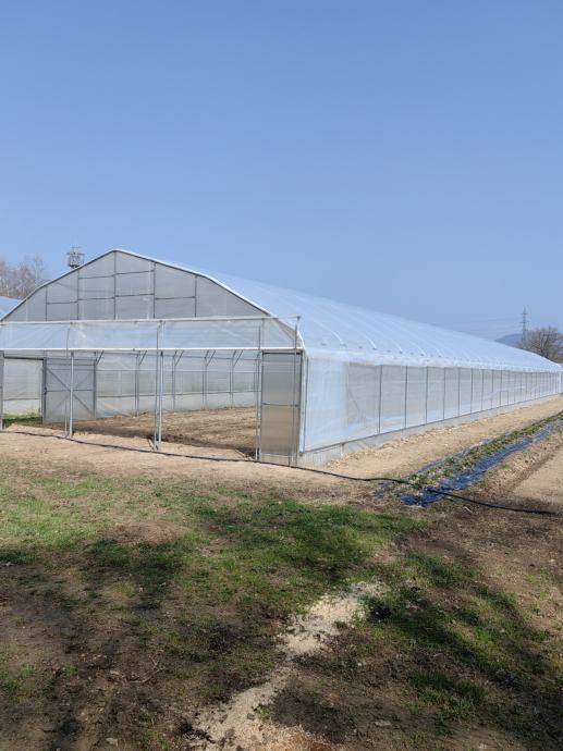 Prodaju se NOVI plastenici dimenzija 10 x 50 m (500 m2).Konstrukcija od pocinčanih cijevi fi 60.3 x 2 mm,rešetka lukova od pocinčanih cijevi fi 32 x 1.5 mm.Razmak lukova na 2.00 metra.Radna visina 3.0 m.Visina bočnog provjetravanja 2.20 m.Pokrov krovišta,bočnih i čeonih stranica je dvostruka folija debljine 200 mic.Čela se podižu namatanjem folije ručno kao i bočne stranice.Na jednoj bočnoj stranici ugrađena su klizna vrata dimenzija 2.00 x 2.00 m.