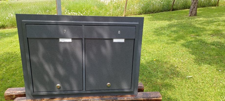 Ugradbeni aluminijski sandučič. Ima dva pretince sa odvojenim vratima i bravama. Dim.59.5x43.5x10