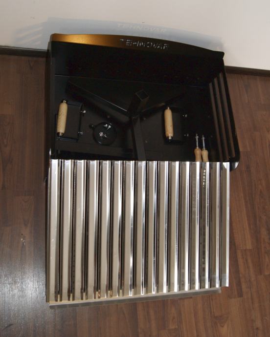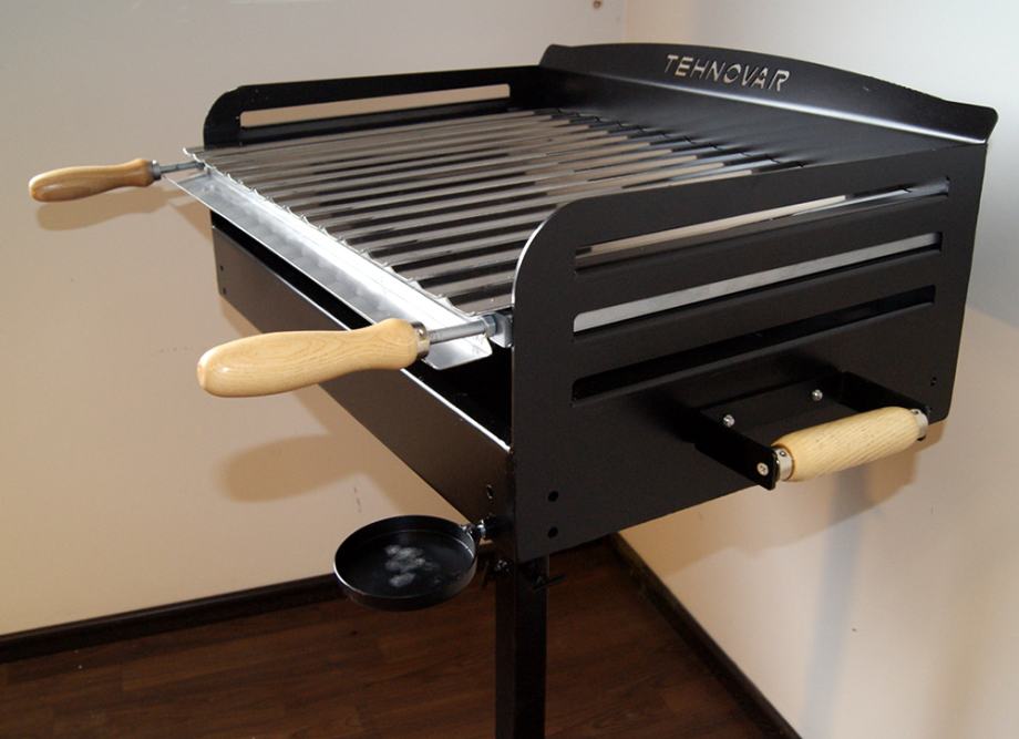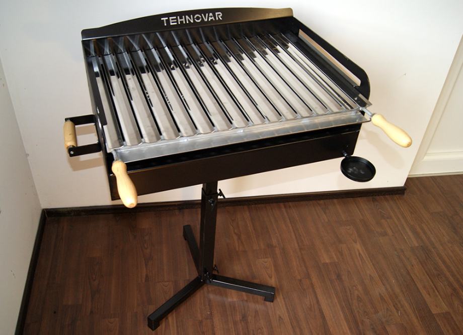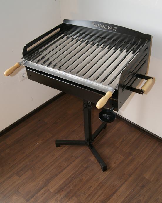 Standardni model rešetke roštilja sa INOX prečkama debljine 2 mm - sa okvirom debljine 5 mm i željeznim ručkama 8 mm sa vanjske strane. Drvene ručke sa prednje strane služe za pomicanje visine pečenja.