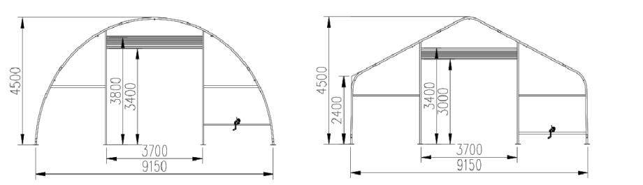 26 × 9.15 m × Visina 4.5 (254 m2 ) C - OBLIK Vatrootporna 750 g cerada, šipke promjer 6-8 cm, Debljina stijenki šipki 1,5-2 mm . Razmak izmedju stupova 2 m. Total 2100 kg. Roll up vrata na prednjoj i stražnjoj strani