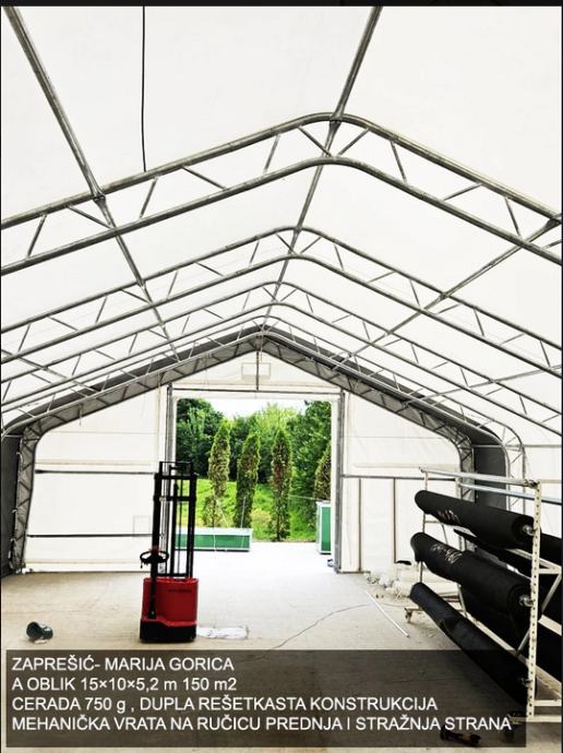 15 × 10 m × Visina 5,2 m (150 m2 ) A OBLIK - Vatrootporna 750 g cerada, rešetkasta konstrukcija duple šipke promjer 6 cm, Debljina stijenki šipki 1,5 mm. Razmak izmedju stupova 2,5 m . Total 2200 kg. Mehanička vrata na ručicu