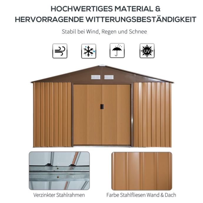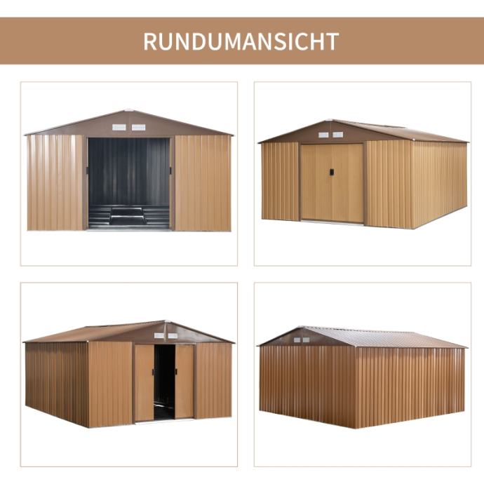 Izrađena od galvaniziranog čelika za otpornost na UV zrake, toplinu, insekte i trulež,.. S jedinstvenim drvenim dezenom i vodoravnim dizajnom ploče, ova serija nudi izgled kakav želite, ali izdržljivost čelika. Osim toga, ima iznimno visoku visinu zida od 180 cm, što u kombinaciji s dizajnom zabatnog krova daje dodatni prostor za glavu i prostor za pohranu. 140cm širokim otvorom vrata nudi dovoljno prostora za većinu kosilica za druge vanjske opreme.