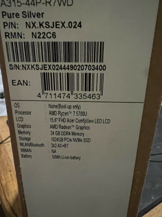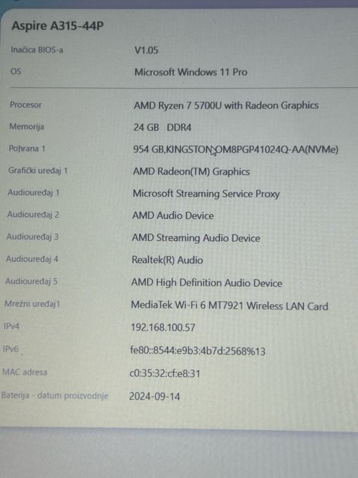Laptop novi izvađen iz kutije stavljeni Windows 11 pro,Ryzen 7 5700u,24gb ddr4 3200,NVME 1Tb,integrirana graficka,garancija do 21.02.2027.kupljen u 2 mjesecu,nedavno upaljen i stavljeni win.