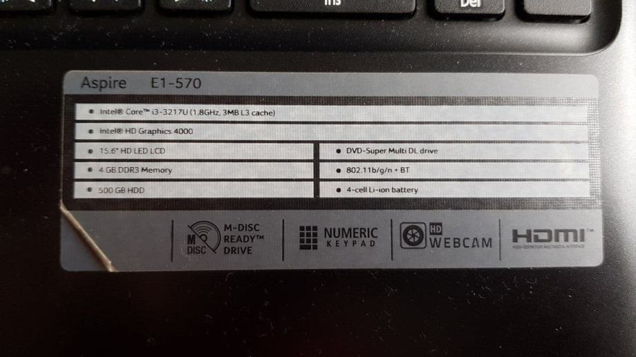 Core i3-3217U 1,8 GHz, bez RAM-a (bilo unutra 4GB DDR3), Intel HD Graphics 4000, 15,6", 1366x768, USB2.0, Bluetooth, WiFi, HDMI, DVD-RW, VGA, Ethernet, bez diska