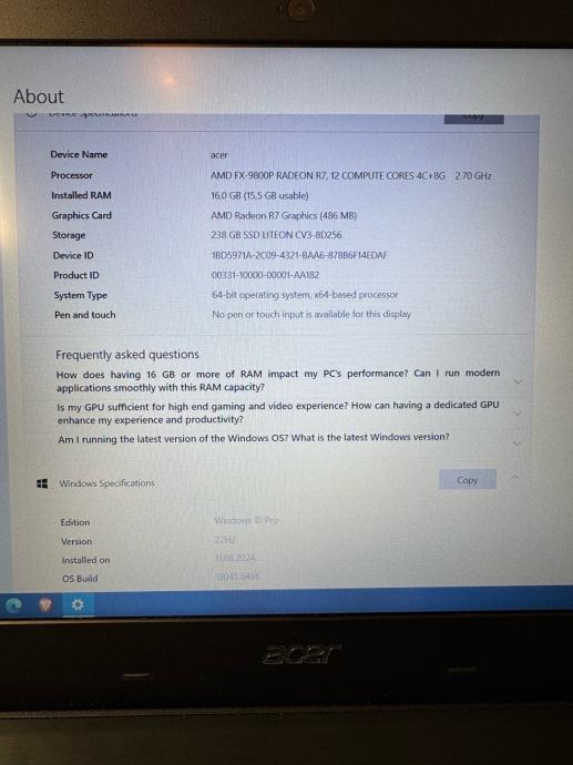 Prodajem laptop ACER. Laptop radi odlično, ali mora uvijek biti na punjaču pošto mu je baterija neispravna. RAM 16 GB, 256 GB SSD.