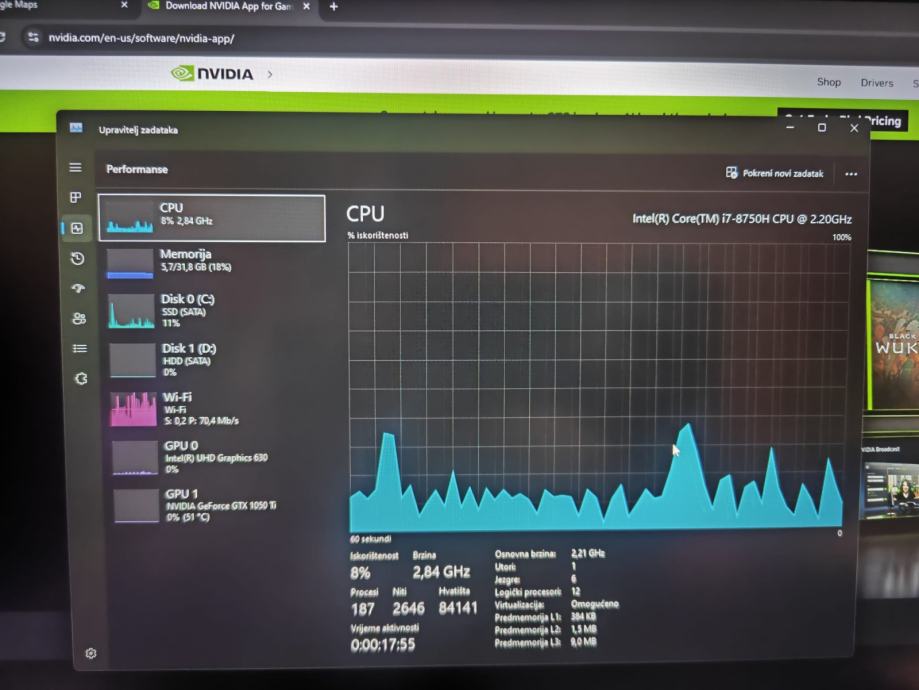 Grafička: Nvidia GeForce GTX 1050Ti + Intel UHD 630