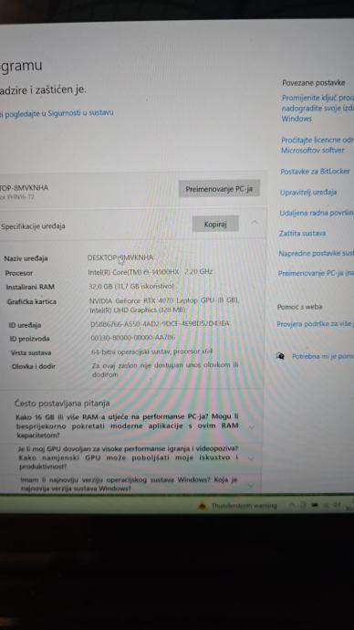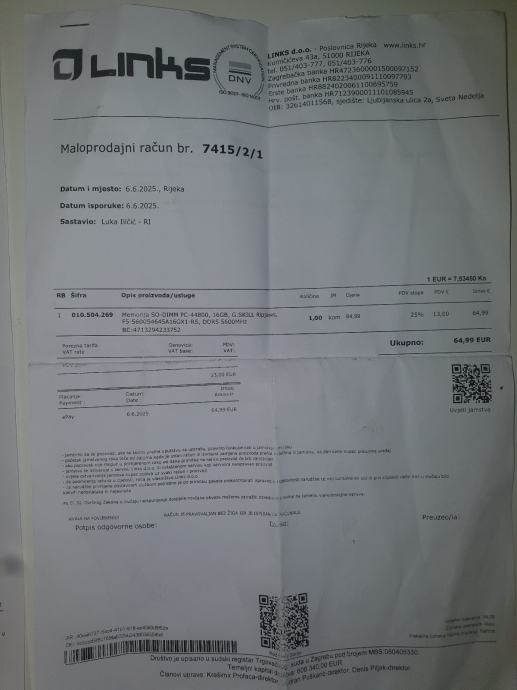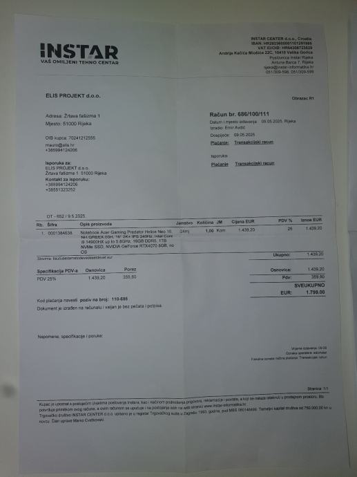 Laptop kupljen 09.05.2025 u Instar informatika dućanu u Rijeci pod cijen od 1800 eur, pod jamstvom je do 09.05.2027 a moguće je nadogradit garanciju na 5 godina