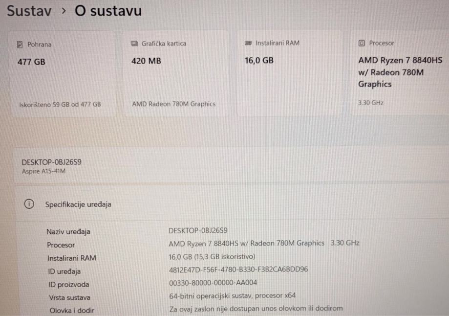 Kupljen u vacomu za 800€ prije par mj, specifikacije su u slikama, kupljen windows 11 pro, u odličnom je stanju i sve radi ispravno.