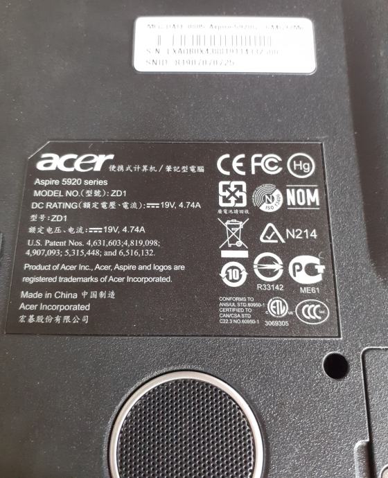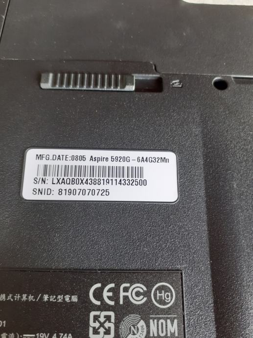 Laptop Acer Aspire manufactured 5920G 0805 dual core, dva puta po 2 gige rama DDR2 ima punjač, ispravan