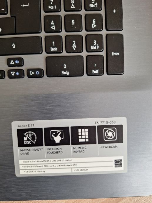 je prijenosno računalo koje uključuje numeričku tipkovnicu, HD web kameru i tvrdi disk od 500 GB. Ovo prijenosno računalo dio je serije Acer Aspire E 17, poznate po svojim značajkama za svakodnevnu upotrebu i balansu između cijene i performansi.