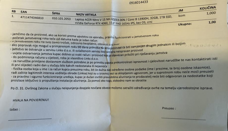 Prodajem potpuno novi laptop acer nitro V15 NH.QQEEX.00N/CORE i9 13900H, 32GB, 1TB SSD, nVidia GeForce RTX 4060, 15.6" 165Hz, CRNI, bez OS.