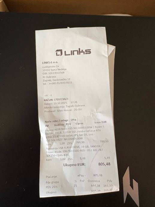 Kupljen 13.10.2025, instaliran windows 11 , laptop koristen par sati i od tad stoji u kutiji.