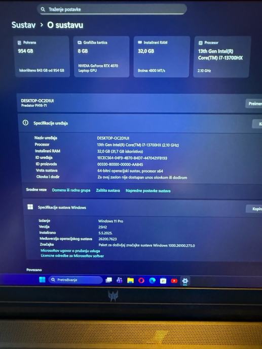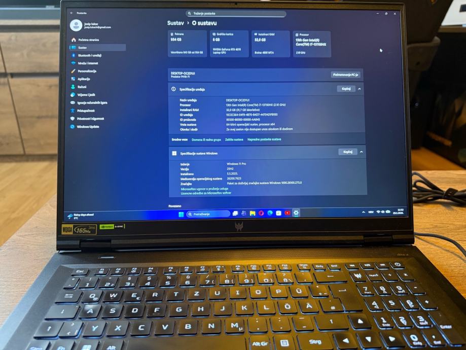 Laptop je u funkcionalnom stanju i pogodan je za zahtjevnije poslove i gaming. Sučelje prikazuje stabilne specifikacije za rad i zabavu.