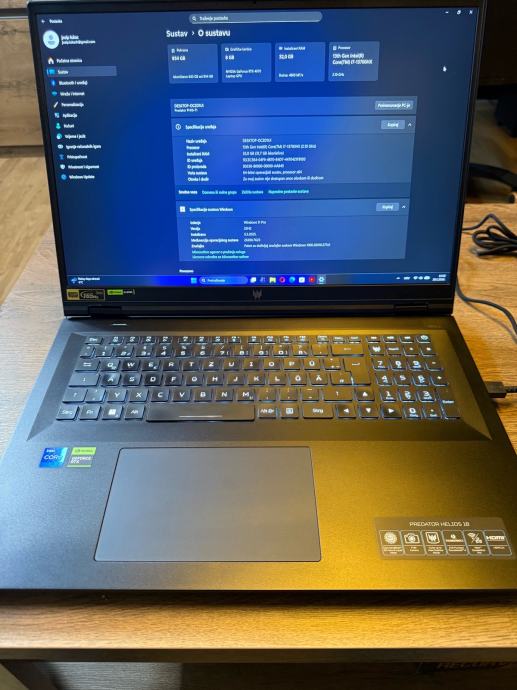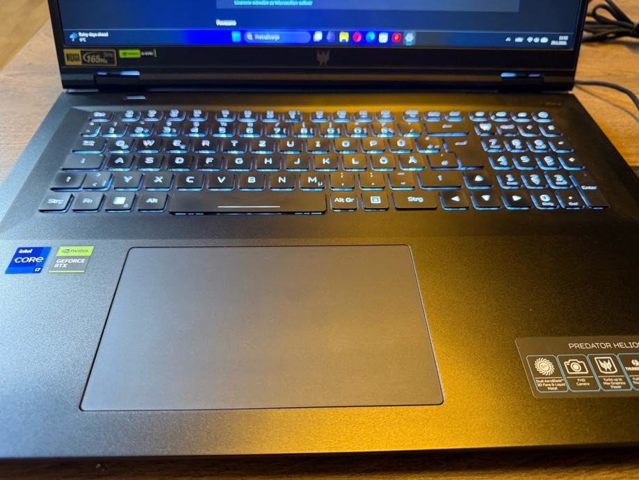 Prodajem Acer Predator Helios gaming laptop. Radi se o modelu s Intel Core procesorom i NVIDIA grafičkom karticom. Laptop ima 18-inčni zaslon, podsvjetljenu tastaturu s numeričkim blokom i prostrani touchpad. Kućište je u tamnoj boji s gaming dizajnom.