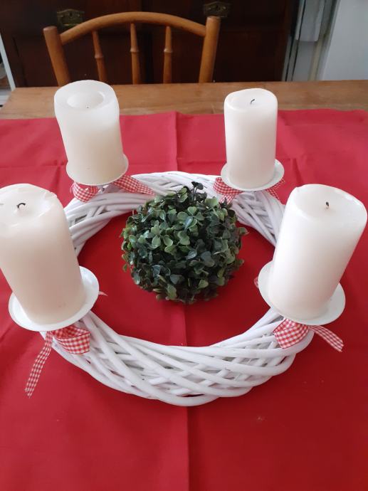 Adventski vijenac pleten od bijelog šiblja s nosačima za svijeće. Promjer 34 cm. U izvrsnom stanju, kao novi.