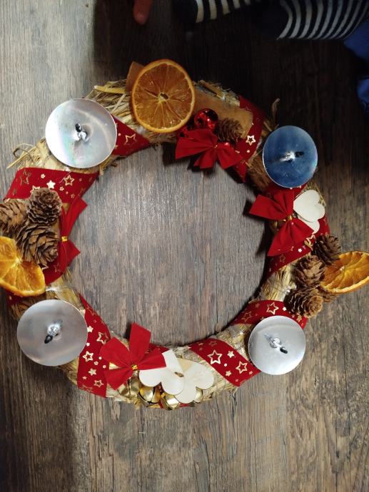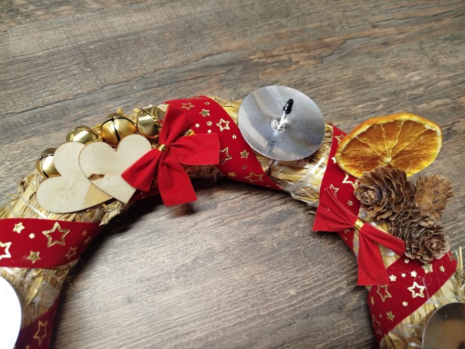 Adventski vijenac za 4 svijeće, na slamnatom vijencu, ručni rad.Mogućnost ručno rađenih svijeća sa mirisom Božića