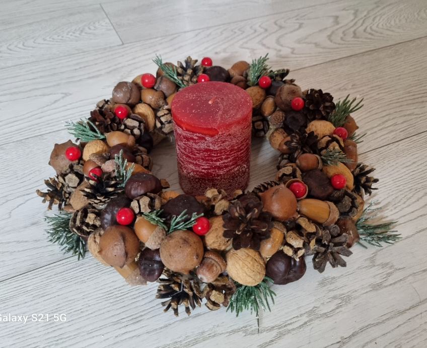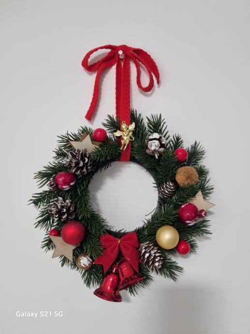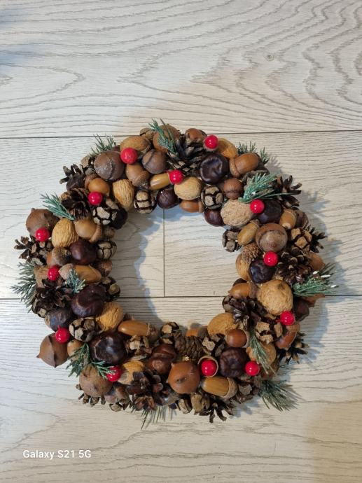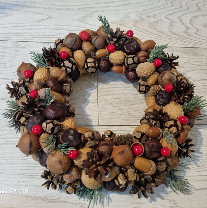 Prodaju se božićni vijenci ručne izrade, izrađeni od prirodnih i dekorativnih elemenata.