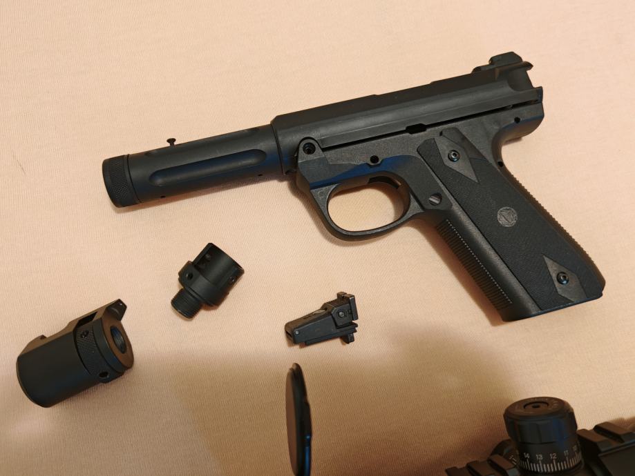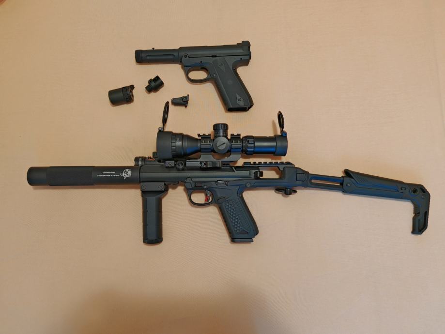 Ojačani klip, 160% spring, podesivi okidač, 310mm 6.01mm cijev, ML hopup bucking, snug shut gumica na magazinu, 20cm Knights armament prigušivač, podesivi laser za CQB sa punjačem itd... Dobijete ga sa svim originalnim dijelovima, plus još hrpu aftermarket stvari, cijev, okidač, metalni adapter za prigušivač za assasin pištolj, drška, gumice, feder, ne znam nabrojati sve.