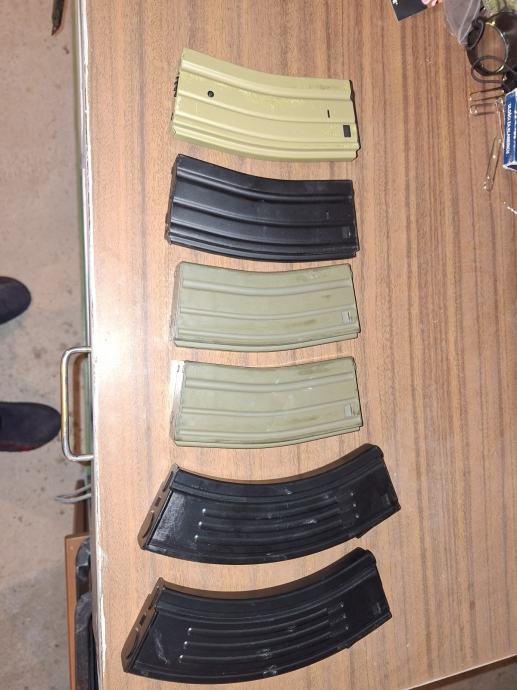 Lot od 6 M4 spremnika, dva AK stil su KingArms, dva zelena su isti KingArms ja mislim, crni hicap je Cybergun a za coyote hicap spremnik neznam.