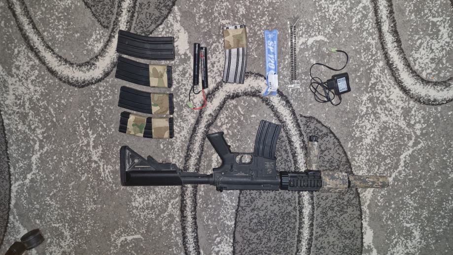 Prodaje se airsoft replika m4 colt, koristena 10tak puta, razlog prodaje kupio jaču pušku, uz nju se dobiva:6 spremnika, 2 dodatne opruge, 2baterije(9.6v)mini tamya,punjač.