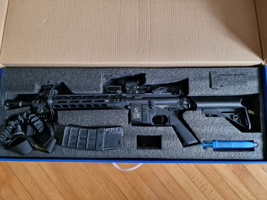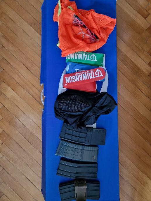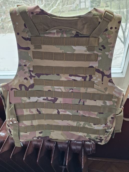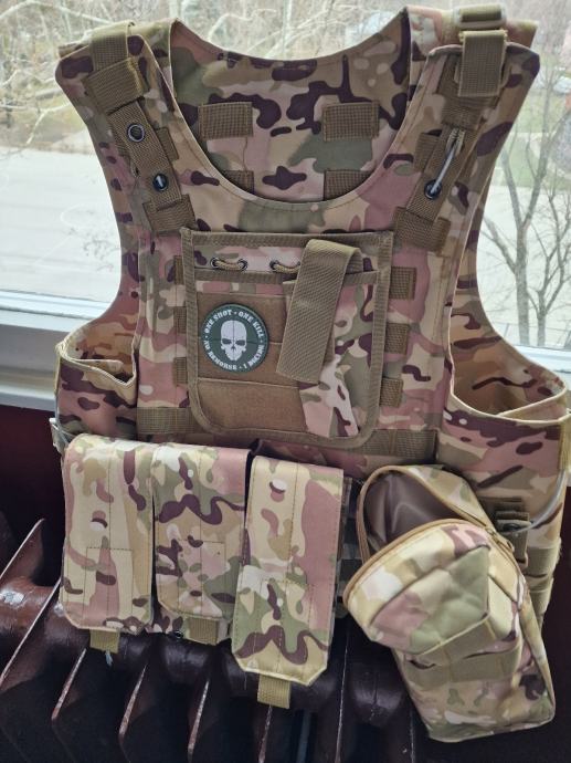 Prodajem rabljenu airsoft opremu koja uključuje kamuflažni prsluk i zaštitnu opremu. Prsluk je opremljen MOLLE sustavom za pričvršćivanje dodatne opreme i ima podesive remene za udobno nošenje. Oprema je korištena za 3 treninga, ali i dalje u dobrom stanju.