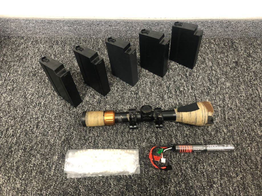 Uz pušku dolaze BB keramičke kuglice, G&G original midcap spremnici - 5 komada (130 round), Classic army nosač optike te Simmons optika 3-9x50.