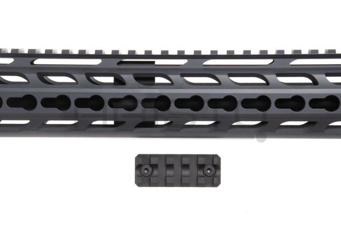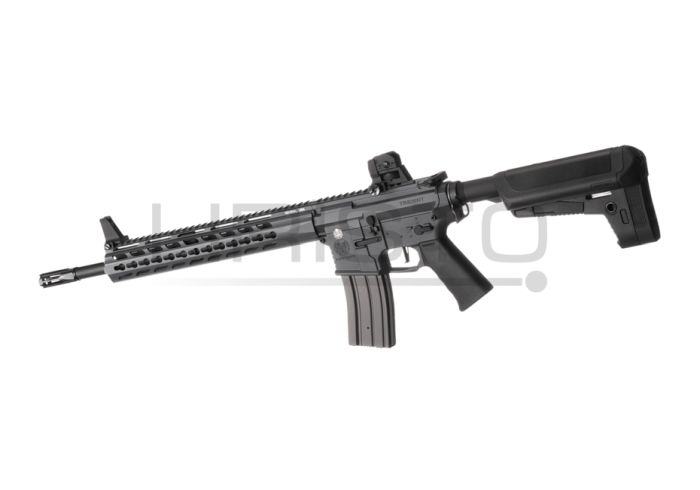 A billet style aluminium alloy receivers are designed to be compatible with almost all M4 style parts and accessories. Flared magwell and enlarged trigger guard at the first glance looks like small changes, but when you pick up this replica and give it couple rounds, it just becomes clear that those changes are great for improving reloading and engagement time. Beyond that those custom receivers just looks great.