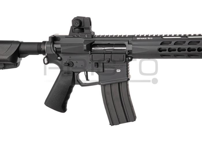 At the front, we can find a high quality 13-inch slim free-float TR113 aluminium handguard licenced by Defiance. It is compatible with Keymod rail system, which combined with long top RIS rail allows the shooter to put on any type of accessories suitable to their preference or mission requirements.