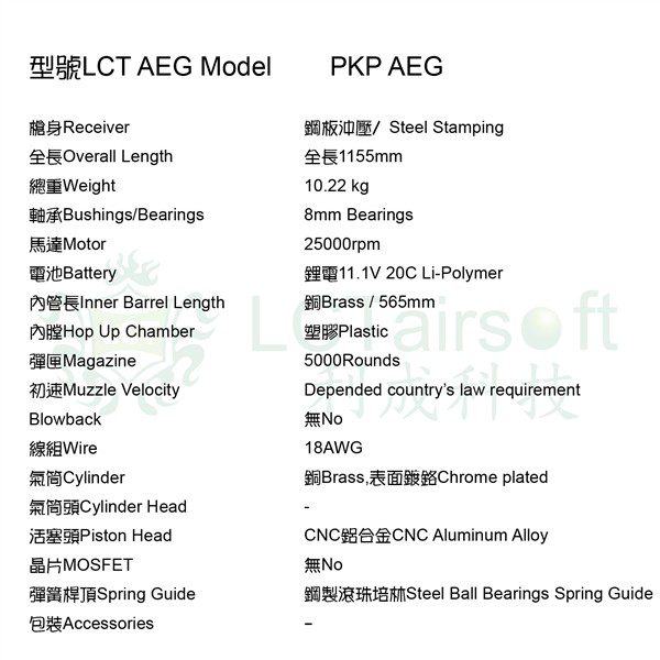 LCT PKP predstavlja vjerojatno najimpresivniju airsoft repliku ovog renomiranog airsoft proizvođača. Ujedno se radi o vrlo prepoznatljivom modernom oružju ruske vojske i specijalnih postrojbi, razvijenom iz legendarnog PK/PKM. Kao što se od LCT i očekuje, izrađen je od čelika, na način na koji je izrađeno i pravo oružje. Ne radi se tu samo o bilo kakvom metalu, već o čeliku, tj. čelično je sve što i na pravom oružju. Tehnologija izrade je prešanje čeličnih limova te lijevanje i strojna obrada.