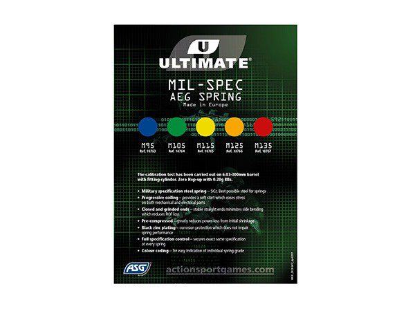 Ultimate Mil-Spec AEG opruge se proizvode iz najboljeg čelika (SiCr) za opruge. Uz minimalni gubitak tvrdoće i konzistentnosti, predstavljaju ultimativnu oprugu za vaš AEG. Radi lakšeg raspoznavanja, označe su bojama.