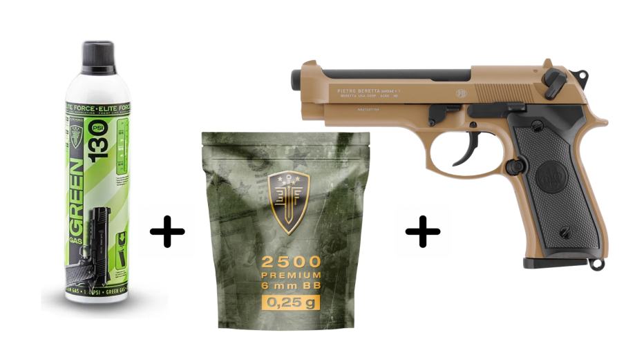 SET uključuje airsoft pištolj Beretta MOD.92 FS + Elite Force Green Gas 130psi + 2500 komada Elite Force Premium BB kuglica.
