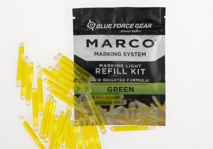 Blue Force Gear Marco komplet punjenja sadrži 30 zamjenskih svjetlosnih štapića u zelenoj boji, namijenjenih za korištenje s Marco svjetlosnim sustavom za označavanje u taktičkim i obučnim situacijama. Svjetlosni štapići dizajnirani su za brzu i diskretnu upotrebu, a pritom nude visoku vidljivost bez potrebe za većim izvorima svjetla.