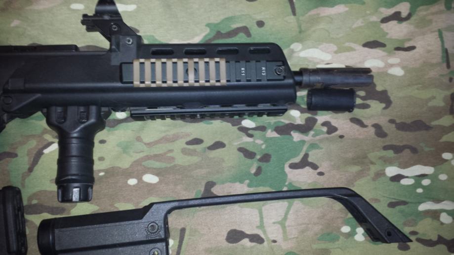 Prodaje se Classic Army G36KE custom airsoft replika. Replika je izvanredno složena iznutra i izvana sa odličnim dijelovima, u repliku je uloženo više od 5.000,00 kn. Ne bavim se airsoftom već dvije godine, replika je minimalno korištena, niti jednom doslovno na terenu odnosno susretu, nabavljena i sređena netom prije prestanka bavljanja airsoftom. Stoji u sobi od tada, zadnji puta provjerena i testirana na proljeće ove godine i sve je radilo kao urica. Replika je potpuno ispravna, zbog dužeg stajanja može biti uputna samo eventualna zamjena gumice po potrebi.