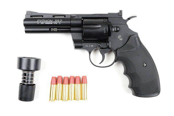 Colt Python revolver s cijevi duljine 4 inča i metalnim tijelom. CO2 ampula od 12g umeće se u dršku, a svaki od 6 realističnih metaka sadrži jednu kuglicu.
