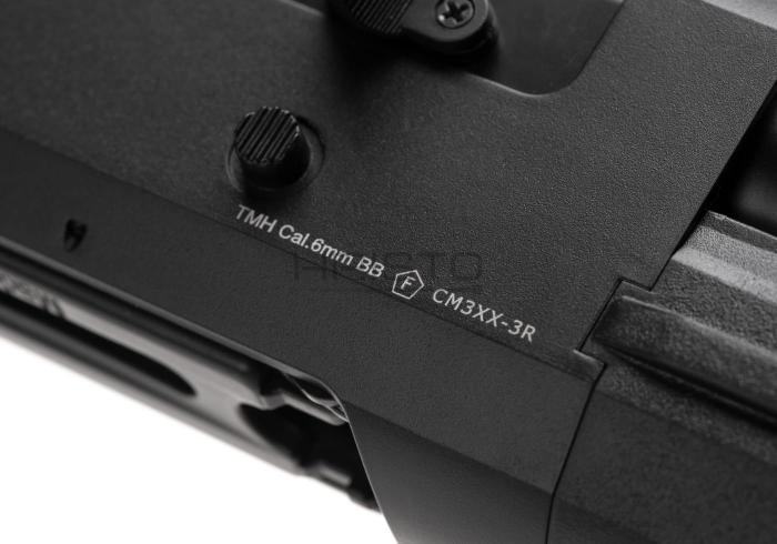 Izrađena od visokokvalitetnog ABS polimera, ova 1040 mm duga opružna replika sačmarice puni se putem izmjenjivog spremnika u obliku standardne sačmene patrone kapaciteta 30 kuglica. CM360L teži oko 1750 g i ispaljuje tri kuglice odjednom iz tri unutarnje cijevi, uz tipično ručno repetiranje „pump-action“ mehanizmom. Kundak s gumiranim završetkom i crni prednji rukohvat izrađeni su u klasičnom stilu, s prihvatima za remen za nošenje.