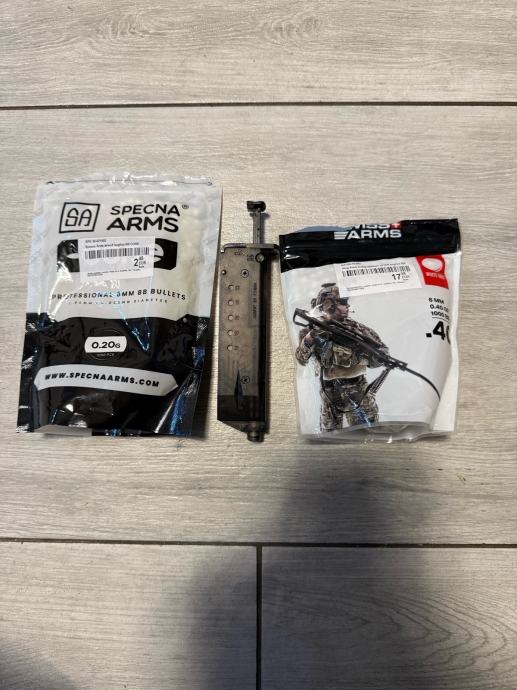 Dajem metke različitih gramaža (jos dvije boce metaka dajem koje nisu na slici) i brzi punjač metaka u spremnik.