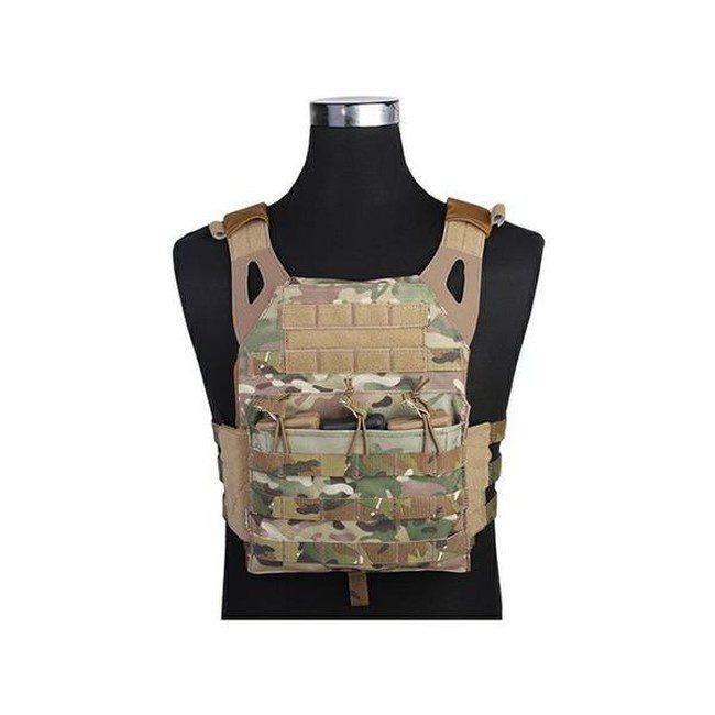 Emerson JPC plate carrier MULTICAM. Prednji i stražnji MOLLE sustav. Prednji čičak panel. Prednji džepovi za spremnike s elastičnom trakom. Podesiv na bokovima i ramenima. U kompletu se isporučuje elastične imitacije ploča.