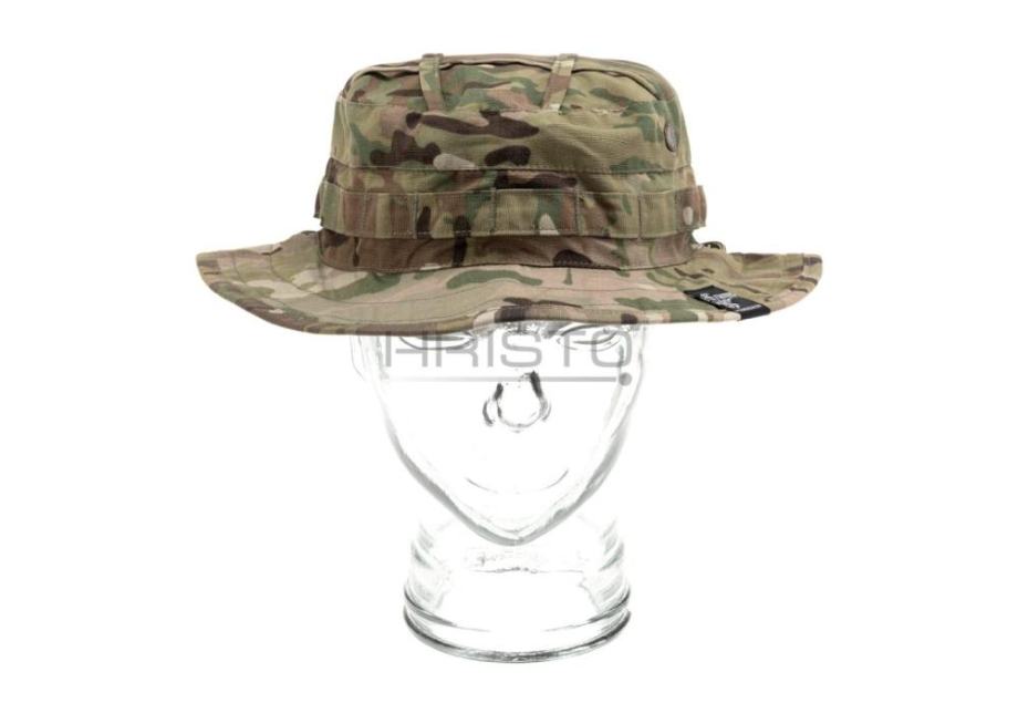 Mod 2 Boonie Hat is manufactured from high-quality rip-stop textile in a Multicam camouflage pattern. It features several improvements over the original design. The rim of the hat was slightly narrowed down to prevent snags in bushes and heavy foliage without omitting the hat's performance. Another modification is adding a piece of fabric that allows the attachment of branches and vegetation. The same was done for the top of the hat in the form of four crossed pieces of cloth. Together, they increase the hat's camouflage properties and break down the head's silhouette.