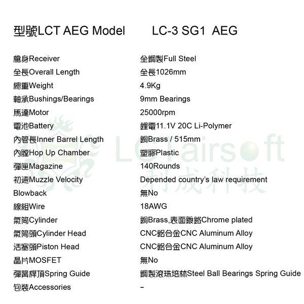 LCT LC-3 SG1 je najimpresivnija replika legendarne LC-3 puške. Tijelo je u potpunosti čelično, iznimno čvrsto sa varovima na ključnim spojevima. Kao i ostatak LCT asortimana i ova replika je izuzetno robusna i čvrsta. Unutrašnjost, kao i vanjština prati kvalitetu LCT standarda.