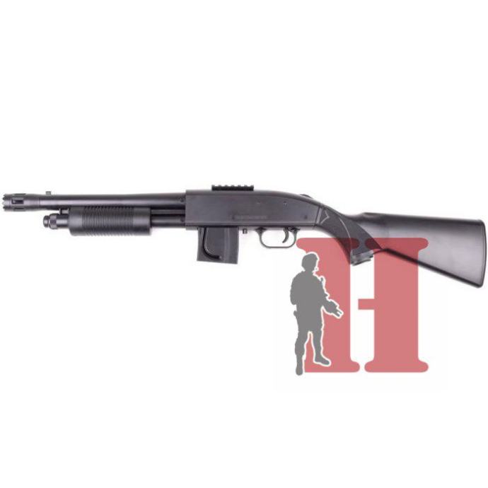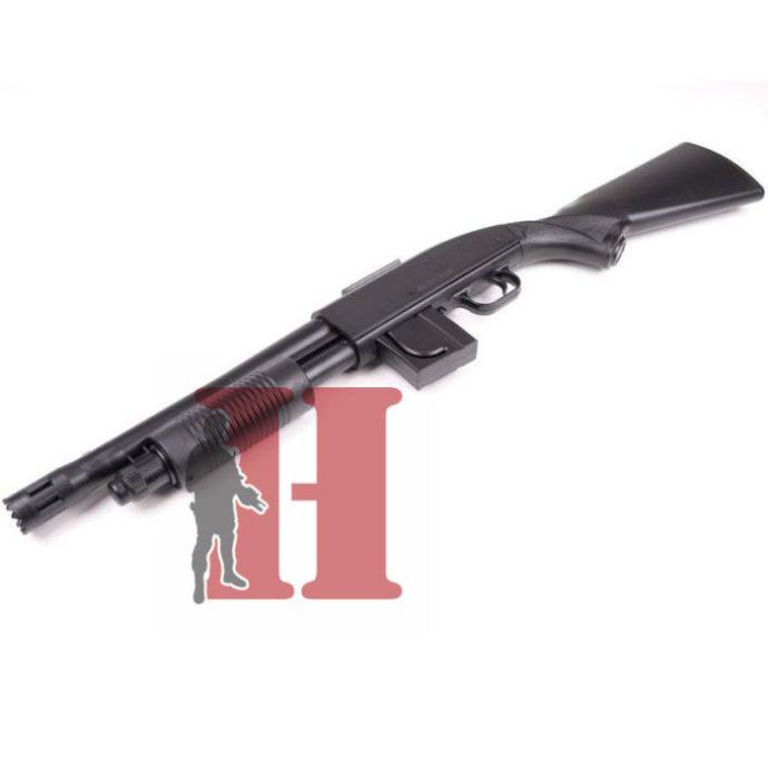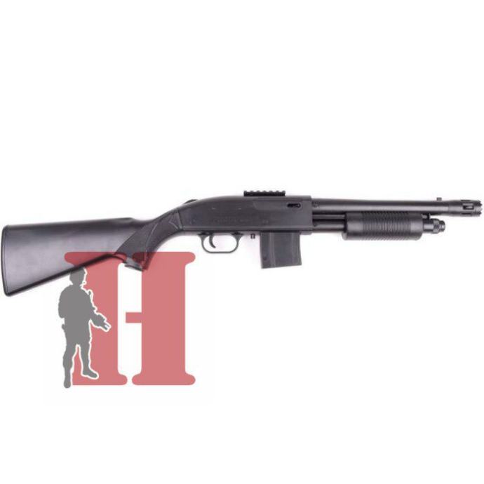 Mossberg M590 replika na oprugu polimernog tijela s punim kundakom. Repetiranje je tzv. pump-action. Replika dolazi sa spremnikom i uputstvom.