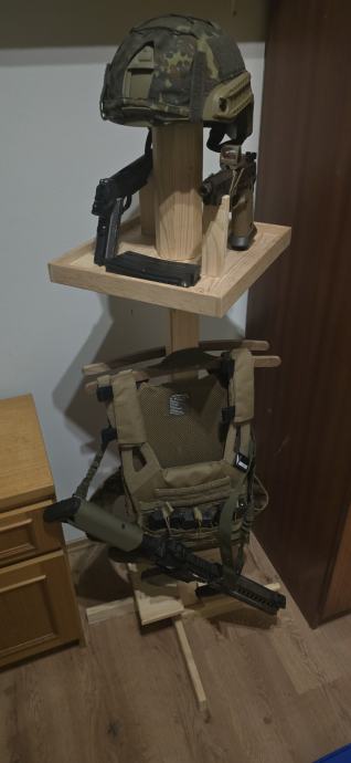 Stalak za svu opremu rucno izrađen sa zaokretnim gornjim dijelom gdje se nalaze replike pištolja.
